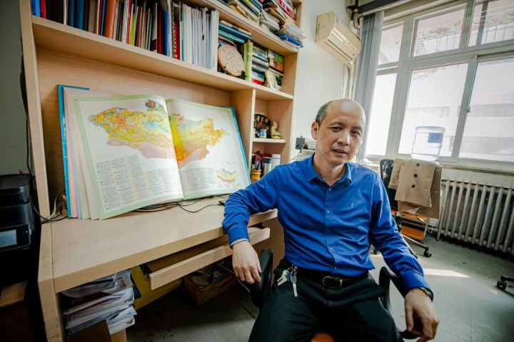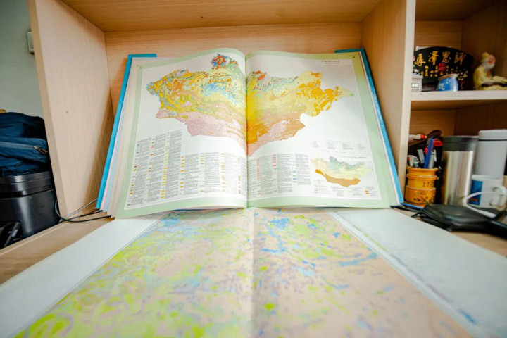书柜对面整合了小书架的书桌上,摊开着一册开本足有半人高的蒙古国地图集。有一次出国参加学术会议的时候,他偶然发现了这本图册,为其中蕴含的丰富信息赞叹不已,就带回国仔细研究。